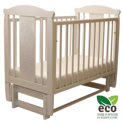 Кроватка декорирована фрезерным рисунком "Слоник". Уникальные фрезерные рисунки размером от 50 см на обеих спинках.